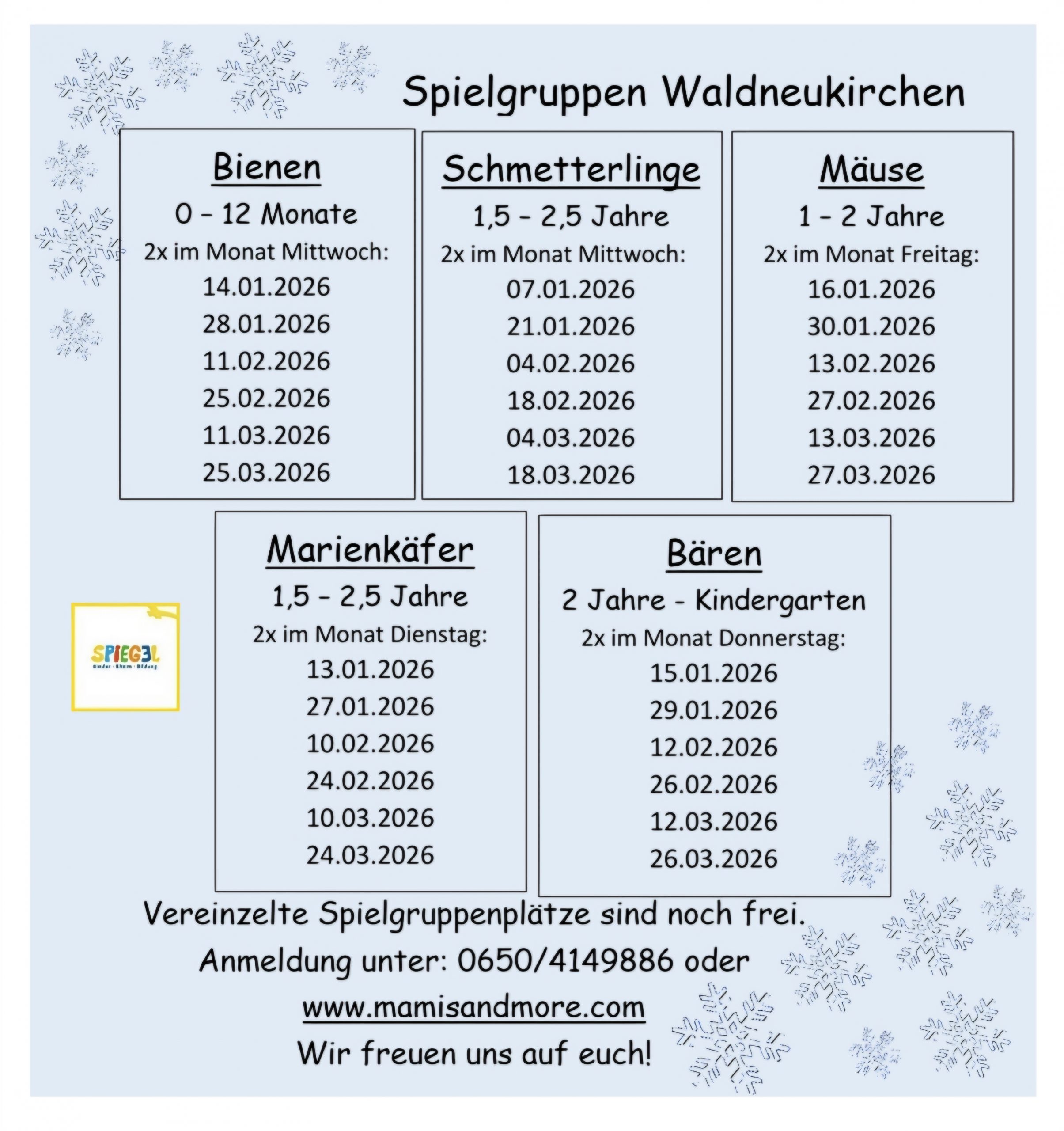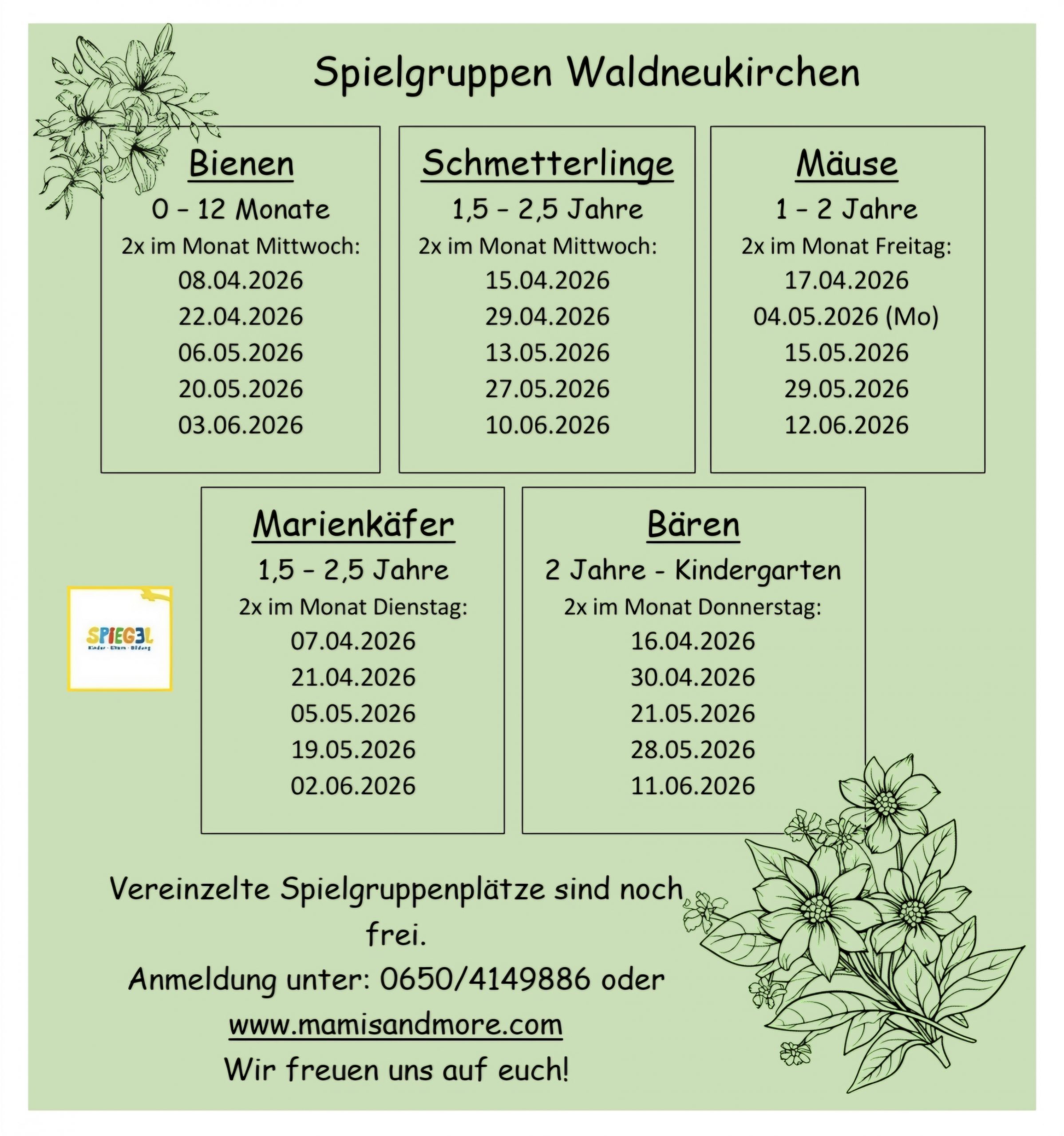 Die Spielgruppen finden im Pfarrheim Waldneukirchen Dorfplatz 12 im Obergeschoss statt.